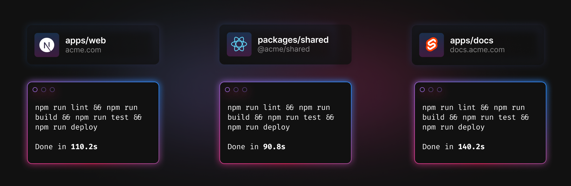 Turborepoは**パッケージのインストールを処理しません**。 `npm`、`pnpm`、`yarn` などのツールはすでに素晴らしい仕事をしています。 ただし、タスクの実行効率が悪いため、CIビルドが遅くなります。