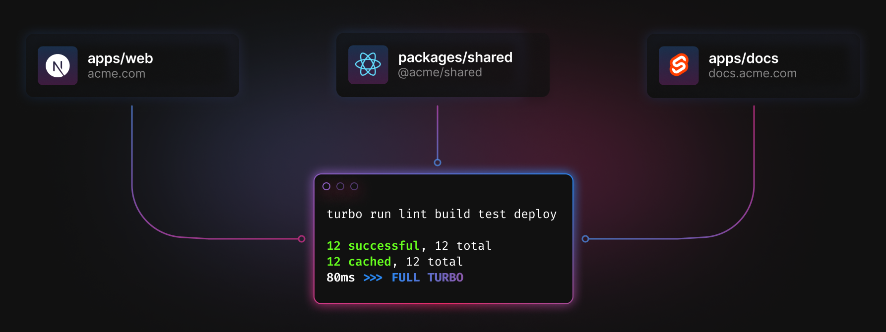 **Turborepoは、モノレポのスケーリング問題を解決します**。 リモートキャッシュはすべてのタスクの結果を保存するため、**CIは同じ作業を2回行う必要がありません**。